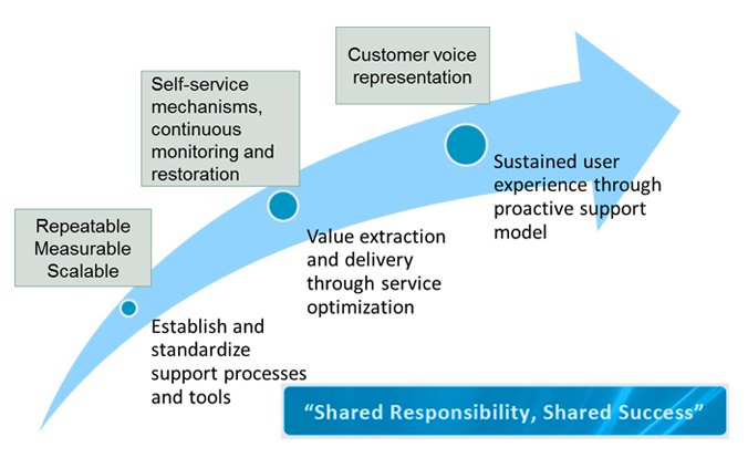 A simple support initiative is just not enough—a fundamental shift in the way user experience gets delivered is imperative. Those leading the charge are the companies that are transforming the user interactions and aligning their business and IT thought leaders and establishing a 'user in the forefront' as a foundation for success. These organizations are thus empowered and compelled to exceed expectations—to anticipate and respond proactively to changing user needs such as new product introduction, privacy / security and/or technology preferences etc.